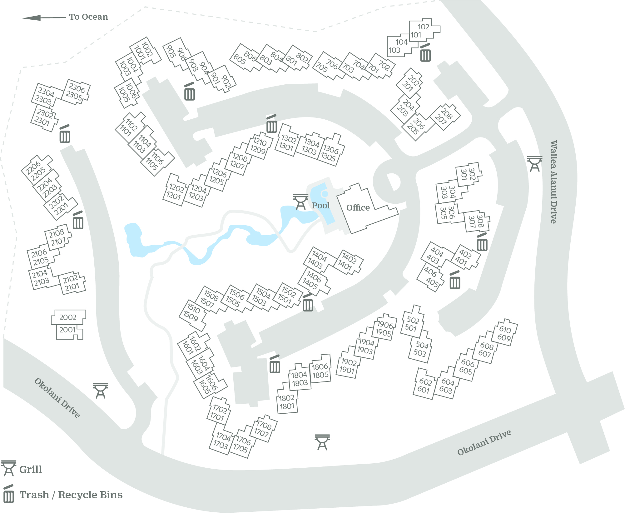 Coming out of the Kahului Airport drive straight on Keolani Place > At the stop light, continue driving straight onto Dairy Road > At Puunene Avenue & Kuihelani Hwy stop light continue driving straight onto Kuihelani Hwy (Hwy 380) > Next stop light (Kuihelani & Honoapiilani) make a left onto Honoapiilani Hwy (Hwy 30) > Continue driving on Honoapiilani Hwy (Hwy 30) for approximately 20 more miles, staying on Hwy 30 bypass, passing Lahaina Town heading out towards Ka’anapali > Driving past Ka’anapali Parkway continue driving North for approximately 1.5 miles > Turn Left on Kai Malina Parkway
