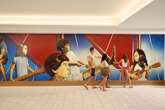 The mural depicts a wa‘a (voyaging canoe), being crewed by keiki (children). The first figure on the left is Hana Kakinami pulling up a fish off the back of the boat. Hana is the great-granddaughter of John Dominis Holt IV, a Native Hawaiian writer, poet and cultural historian.