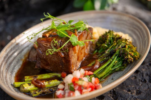 HOT ENTRÉESKalua pork, cabbage & sweet onions gf Herb brined pork chop with wild mushrooms gf Roasted kabocha squash, beet & broccolini risotto vgf Strip steak with truffled mashed potatoes vgf North Shore garlic shrimp plate gf Furikake seared Hawaiian ahi Fresh catch tacos & corn tortilla chips |