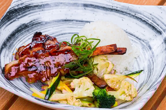Grilled chicken marinated in a soy and ginger sauce | steamed rice | stir fried veggies